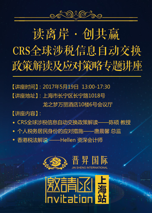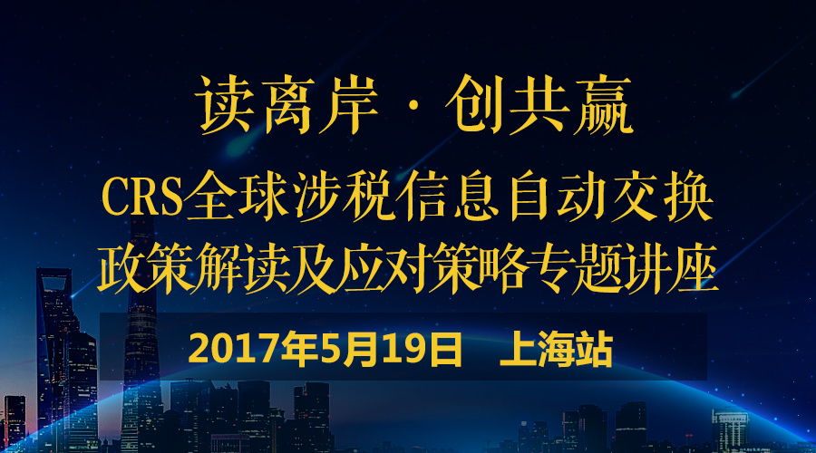 但正確應(yīng)對CRS的前提是,你必須對CRS有全面、深入的了解。鑒于CRS與我司客戶的利益息息相關(guān),為了讓廣大客戶更深刻地了解CRS,更好地應(yīng)對CRS可能帶給大家的影響,我司特別安排了一系列CRS專題講座。5月19日,我司將舉辦第五場(上海站)CRS講座,并邀請了多位老師為大家全方位解讀CRS,詳細對CRS的熱點政策、實施步驟及各類風(fēng)險作深度的剖析解讀,并提出合理的解決方案,以幫助大家更好地應(yīng)對CRS。有興趣的朋友趕緊報名參加我們的講座,現(xiàn)場名額有限,先到先得哦~