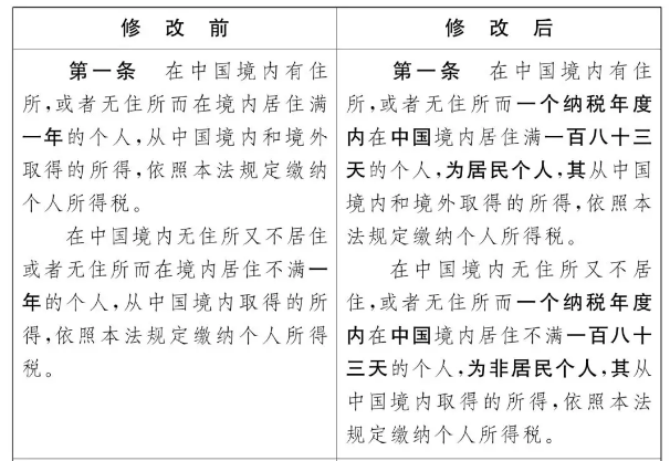 依據(jù)財政部部長劉昆關(guān)于《中華人民共和國個人所得稅法修正案(草案)》的說明,個稅法對財政居民的規(guī)則已做更改:將“在我國境內(nèi)居住的時間”作為斷定居民個人和非居民個人的依據(jù),由“是否居住滿1年”調(diào)整為“是否居住滿183天”。詳細(xì)條文更改請見下圖: