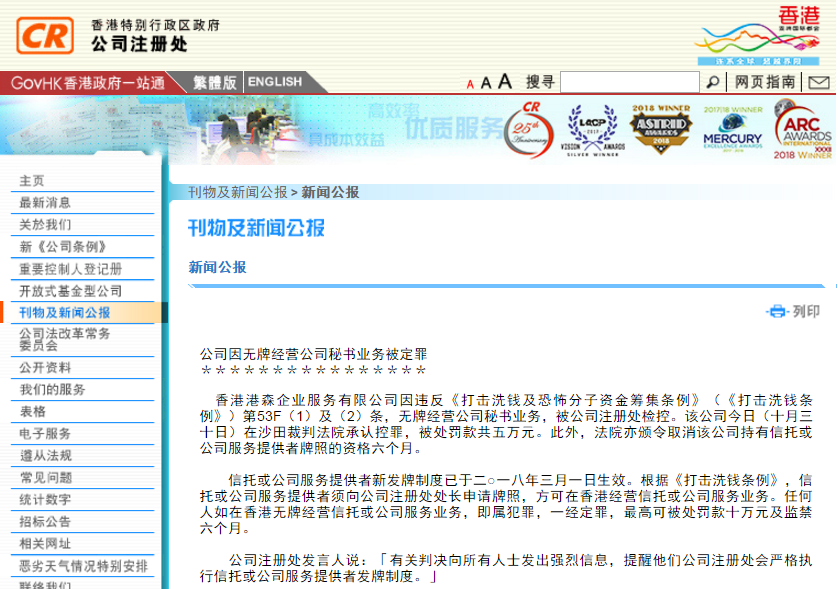 據(jù)中國香港特別行政區(qū)政府公司注冊處最新官方刊物及新聞公報,中國香港港森企業(yè)服務(wù)有限公司因違反《打擊洗錢及恐怖分子資金籌集條例》(《打擊洗錢條例》)第53F(1)及(2)條,無牌經(jīng)營公司秘書業(yè)務(wù),被公司注冊處檢控。該公司今日(十月三十日)在沙田裁判法院承認(rèn)控罪,被處罰款共五萬元。此外,法院亦頒令取消該公司持有信托或公司服務(wù)提供者牌照的資格六個月。