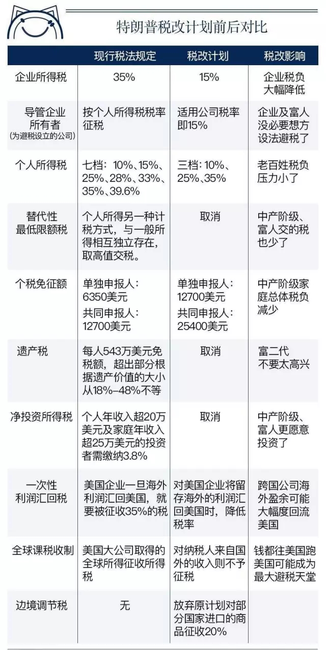 特朗普團隊這次的稅改政策,堪稱史上有誠意的減稅,其中包括減輕個人稅、減輕中產階級家庭稅、降低企業(yè)所得稅、取消"遺產稅"等。在企業(yè)稅方面,川普減稅從35%下降到15%,美國企業(yè)利潤將因此增加30%,股市可能上漲10%到20%甚至更多,美國股市因此大漲特漲。個人所得稅上,將標準扣除額翻倍,比如原來已婚人士合并申報標準扣除額為12700美元,現(xiàn)在達到25400美元,三分之二的家庭會因此受惠。