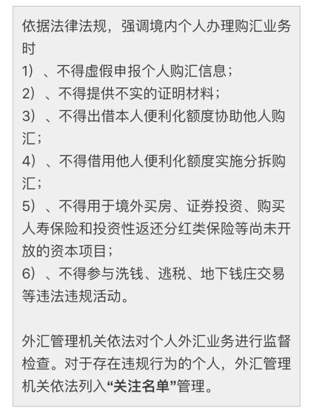 新政以前一次可以多可以匯五萬(wàn)美元,新政實(shí)施后每次只能匯一萬(wàn)美元。頻繁匯款可能會(huì)被懷疑成"螞蟻搬家"列入關(guān)注名單,取消5萬(wàn)匯購(gòu)額度2年。