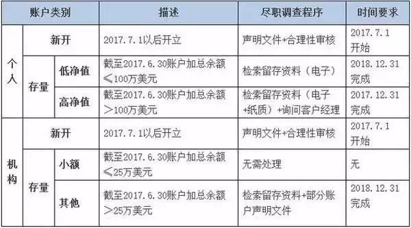 2018年12月31日前,完成對(duì)其余存量個(gè)人低凈值賬戶(hù)和所有存量客戶(hù)的盡職調(diào)查程序,識(shí)別其中的非居民賬戶(hù)。