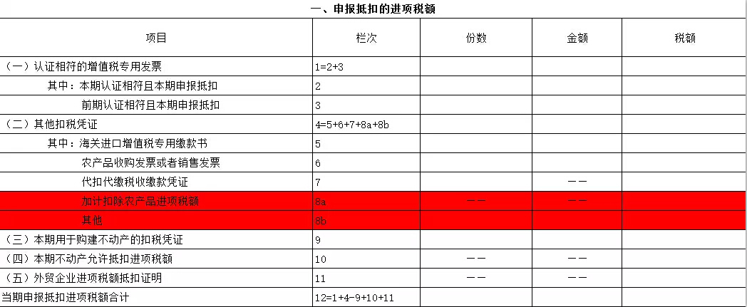 新增8a"加計扣除農(nóng)產(chǎn)品進項稅額"欄,填寫納稅人將購進的農(nóng)產(chǎn)品用于生產(chǎn)銷售或委托受托加工17%稅率時,為維持原農(nóng)產(chǎn)品扣除力度不變加計扣除的農(nóng)產(chǎn)品進項稅額。該欄不填寫"份數(shù)""金額",執(zhí)行農(nóng)產(chǎn)品增值稅進項稅額核定扣除辦法的農(nóng)產(chǎn)品進項稅額不填列在該欄。