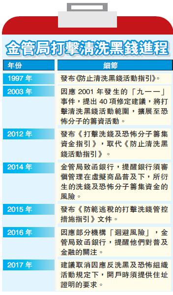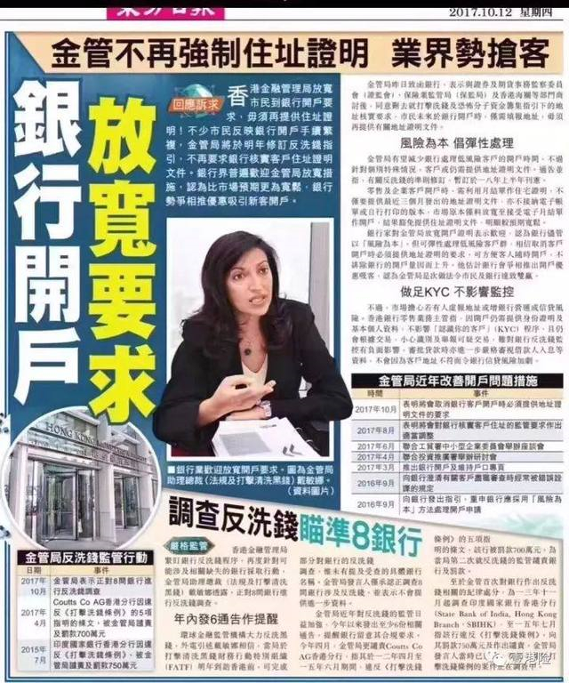 2018年上半年新措施實施后,一般客戶開戶,只需填報地址,而毋須再因反洗黑等規(guī)定而要提交住址證明以作核實,有望大大提升開戶的時間。但在此次審核要求有所放寬的同時,金管局打擊洗錢及恐怖分子資金籌集的力度并未減弱,金管局確認,正在對8間銀行進行反洗錢調(diào)查。