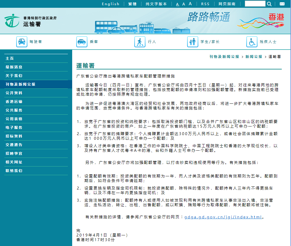 中國香港運輸署正式4月1日宣布,廣東省公安廳4月15日起,對往來粵港兩地的跨境私家車配額制度采取新的管理措施,包括放寬配額的申請準則和加強配額管理。(新措施實施前已受理或批準的申請,仍按照原有規(guī)定處理。)