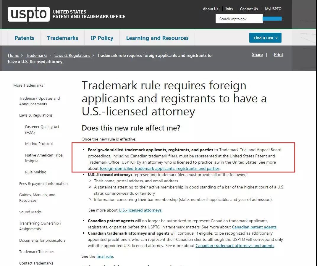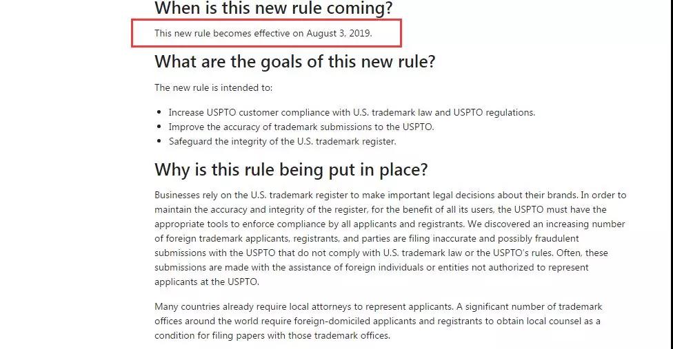 7月2日,美國專利商標局(USPTO)官宣:新的商標規(guī)則,要求外國商標申請人必須由在美國執(zhí)業(yè)的律師代理,新商標規(guī)則的生效日期為2019年8月3日。