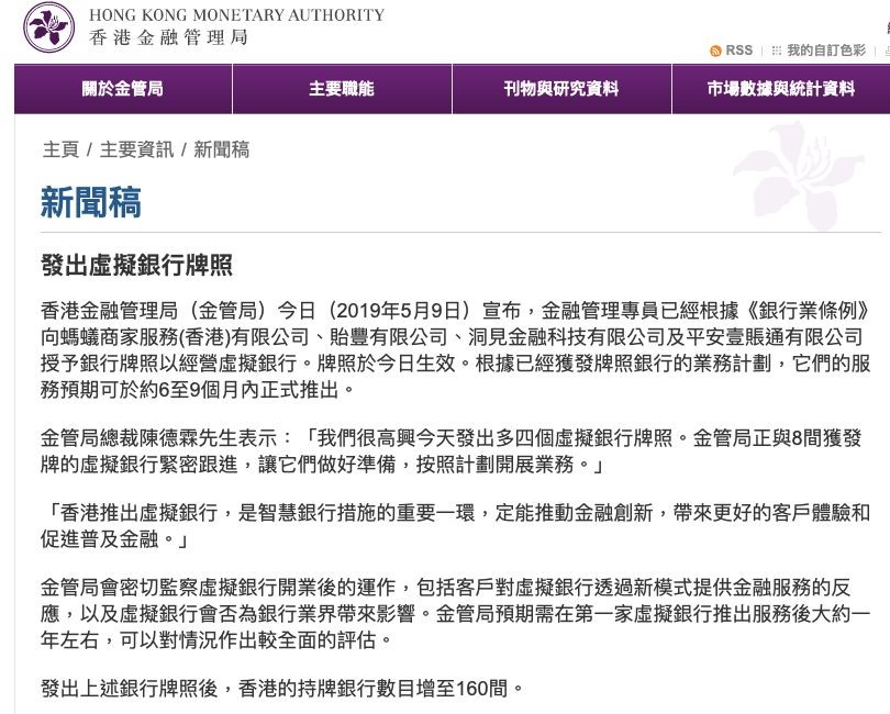 2018年2月和5月,金管局兩次修訂《虛擬銀行的認可》指引并進行了市場咨詢,其中提出銀行、金融機構及科技公司均可申請在中國香港持有和經營虛擬銀行。