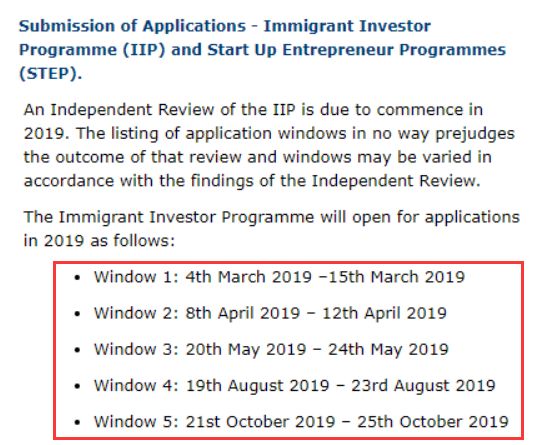 愛爾蘭投資移居計劃(The Immigrant Investor Programme, IIP)自2012年開放,主要面向想要投資移居愛爾蘭的非歐盟國家公民。投資移居投資移居的最低投資額為100萬歐元,最短投資期為3年,家庭凈資產(chǎn)需達(dá)到最低200萬歐元 。愛爾蘭移居局也公布了2019年的申請窗口,具體如下: