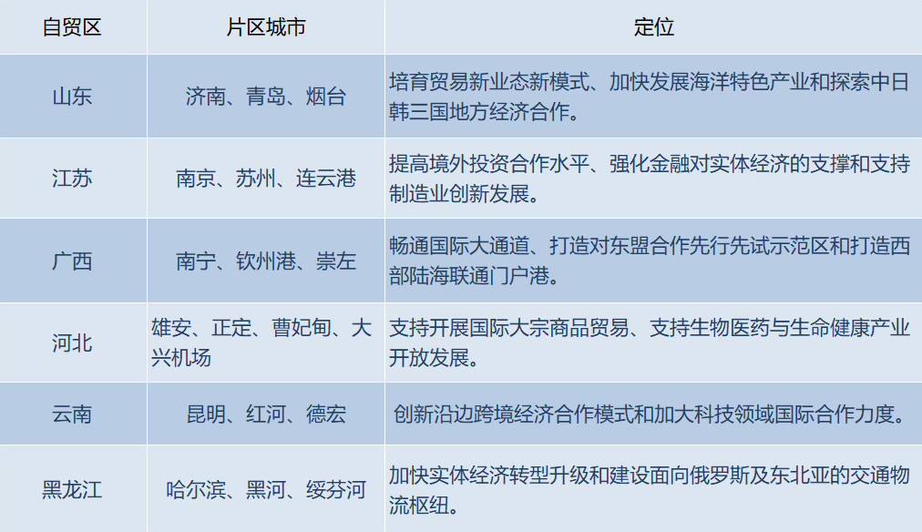 8月26日,國務(wù)院印發(fā)《中國(山東)、(江蘇)、(廣西)、(河北)、(云南)、(黑龍江)自由貿(mào)易試驗區(qū)總體方案》。8月30日,6個新設(shè)自貿(mào)試驗區(qū)正式掛牌成立。隨著山東、江蘇、河北新設(shè)自貿(mào)區(qū),我國沿海省份自貿(mào)區(qū)實現(xiàn)全覆蓋;而廣西、云南、黑龍江新設(shè)自貿(mào)區(qū),則讓自貿(mào)區(qū)在沿邊地區(qū)首次落地生根。