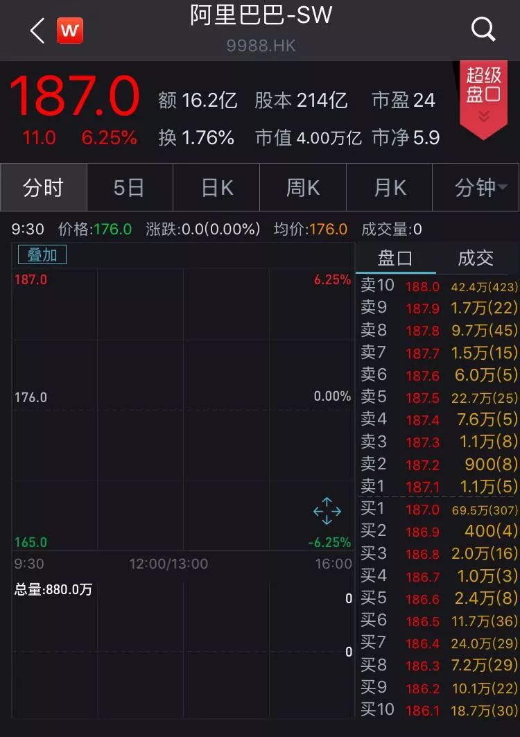 今天,阿里巴巴集團(tuán)時(shí)隔七年后重回港股市場(chǎng),開(kāi)盤(pán)漲6.25%,報(bào)187港元,市值達(dá)4萬(wàn)億港元,取代騰訊成為港股市場(chǎng)新股王。