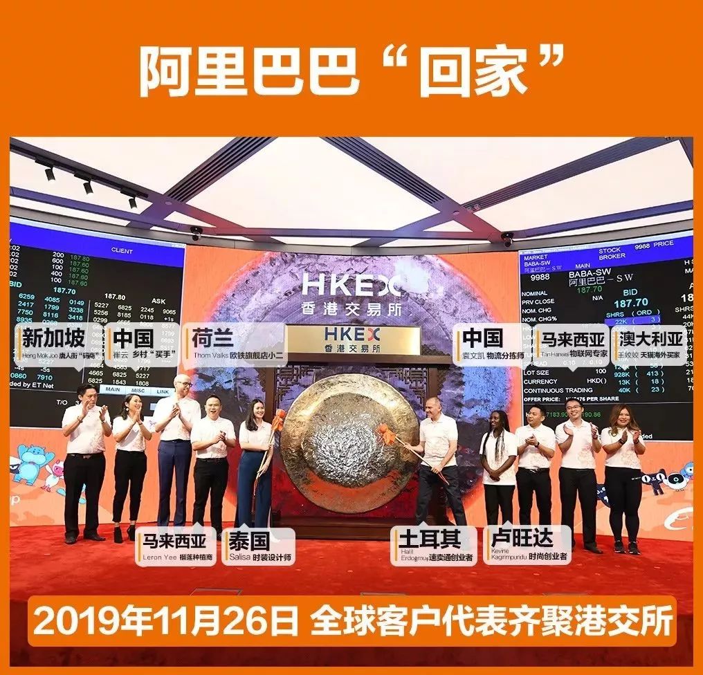 11月26日9點(diǎn)30分,阿里巴巴集團(tuán)在中國(guó)香港交易所鳴鑼上市,開(kāi)盤(pán)價(jià)187港元,較發(fā)行價(jià)大漲6.25%,阿里巴巴集團(tuán)成為首個(gè)同時(shí)在美股和港股兩地上市的中國(guó)互聯(lián)網(wǎng)公司。