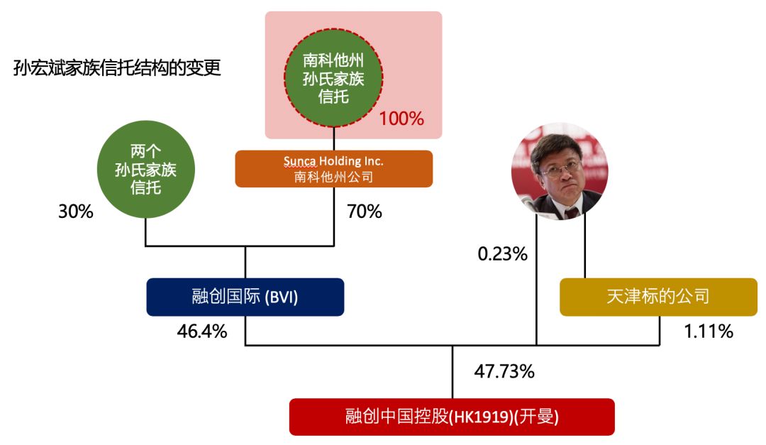 2018年5月及6月,孫宏斌先是設(shè)了兩個(gè)孫氏家族信托,裝入了約14%融創(chuàng)股份,總價(jià)值約138億,受益人是其家庭成員。然后在2018年的最后一天,孫宏斌將所持融創(chuàng)總股份約32.47%,總價(jià)值約321億的股票,轉(zhuǎn)入了設(shè)在美國(guó)南科他州的離岸家族信托,受益人是孫宏斌及其家庭成員。