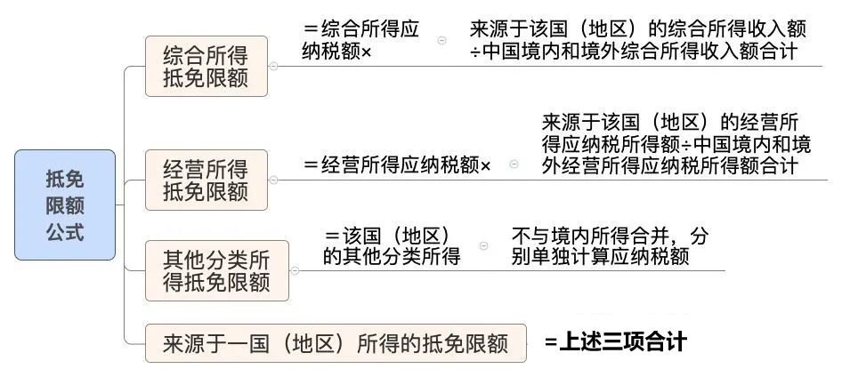 居民個(gè)人來(lái)源于一國(guó)(地區(qū))的綜合所得、經(jīng)營(yíng)所得以及其他分類(lèi)所得項(xiàng)目的應(yīng)納稅額為其抵免限額,按照下列公式計(jì)算: