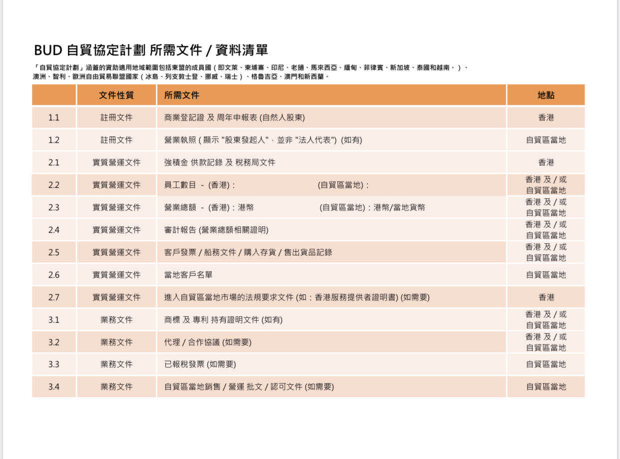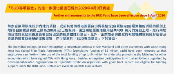 早在2019年度8月財(cái)政司司長就進(jìn)一步向BUD專項(xiàng)基金注資總計(jì)20億元,進(jìn)一步擴(kuò)大基金的資助適用范圍至涵蓋所有在至及將來與中國香港簽署自貿(mào)協(xié)定的經(jīng)濟(jì)體,推出「自貿(mào)協(xié)定計(jì)劃」(東盟計(jì)劃被納入其下),讓企業(yè)可開拓新市場及新商機(jī)。